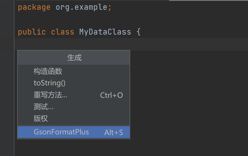然后我们随便创建一个类,就叫MyDataClass好了。在类内部空白处点右键选择生成,就可以看见如下选项。