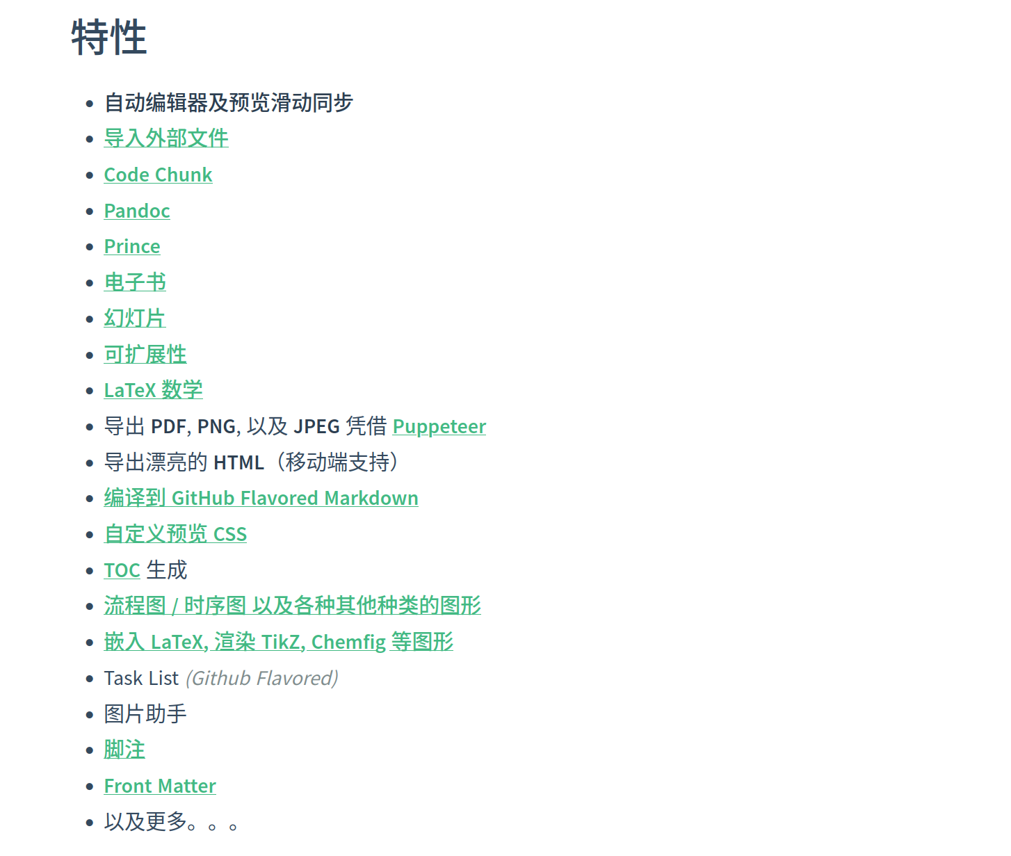 在扩展商店搜MarkDown Preview Enhanced这个插件并安装后可以大幅增强MarkDown的功能,下图中列举了它的一些特性。