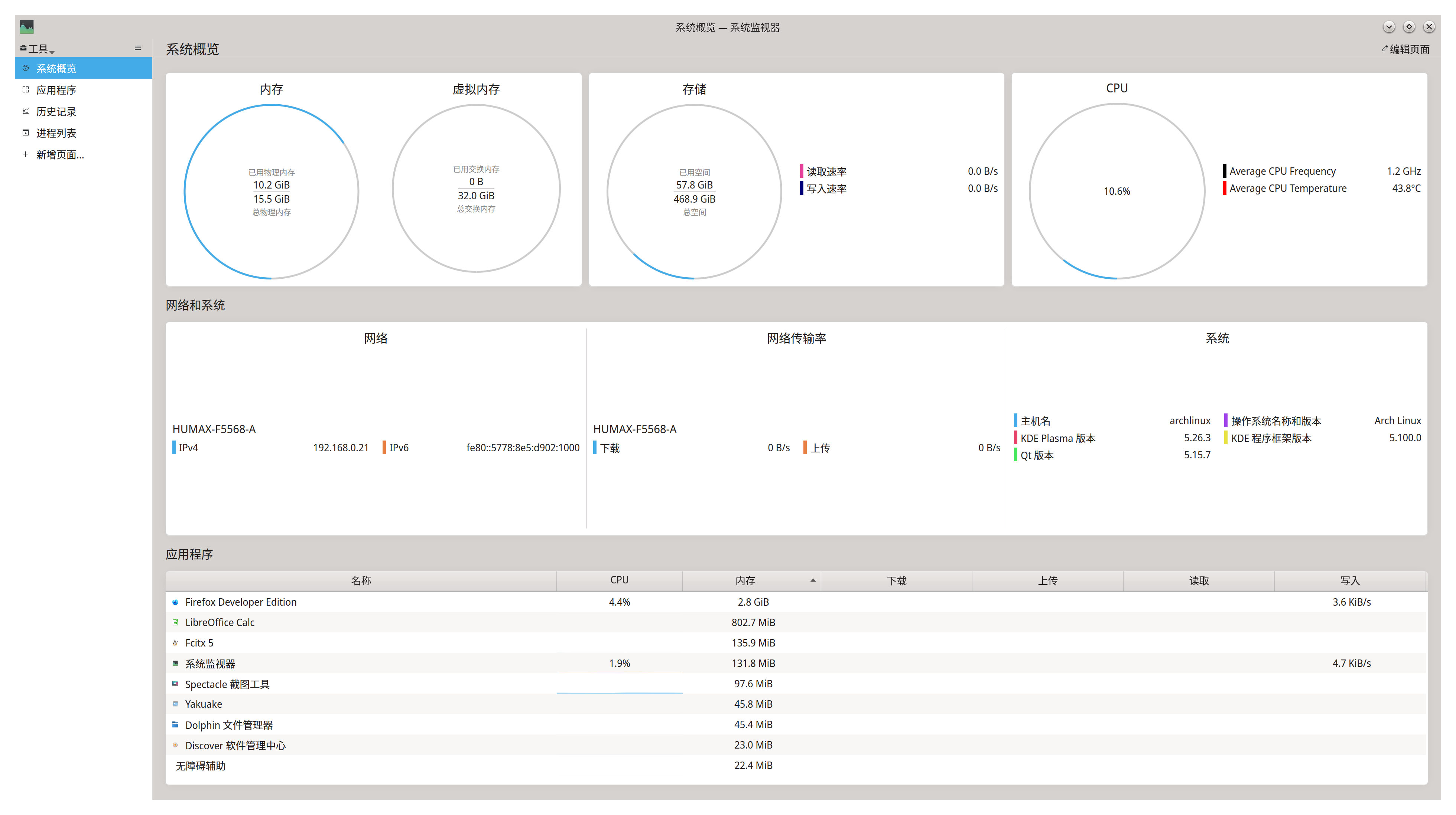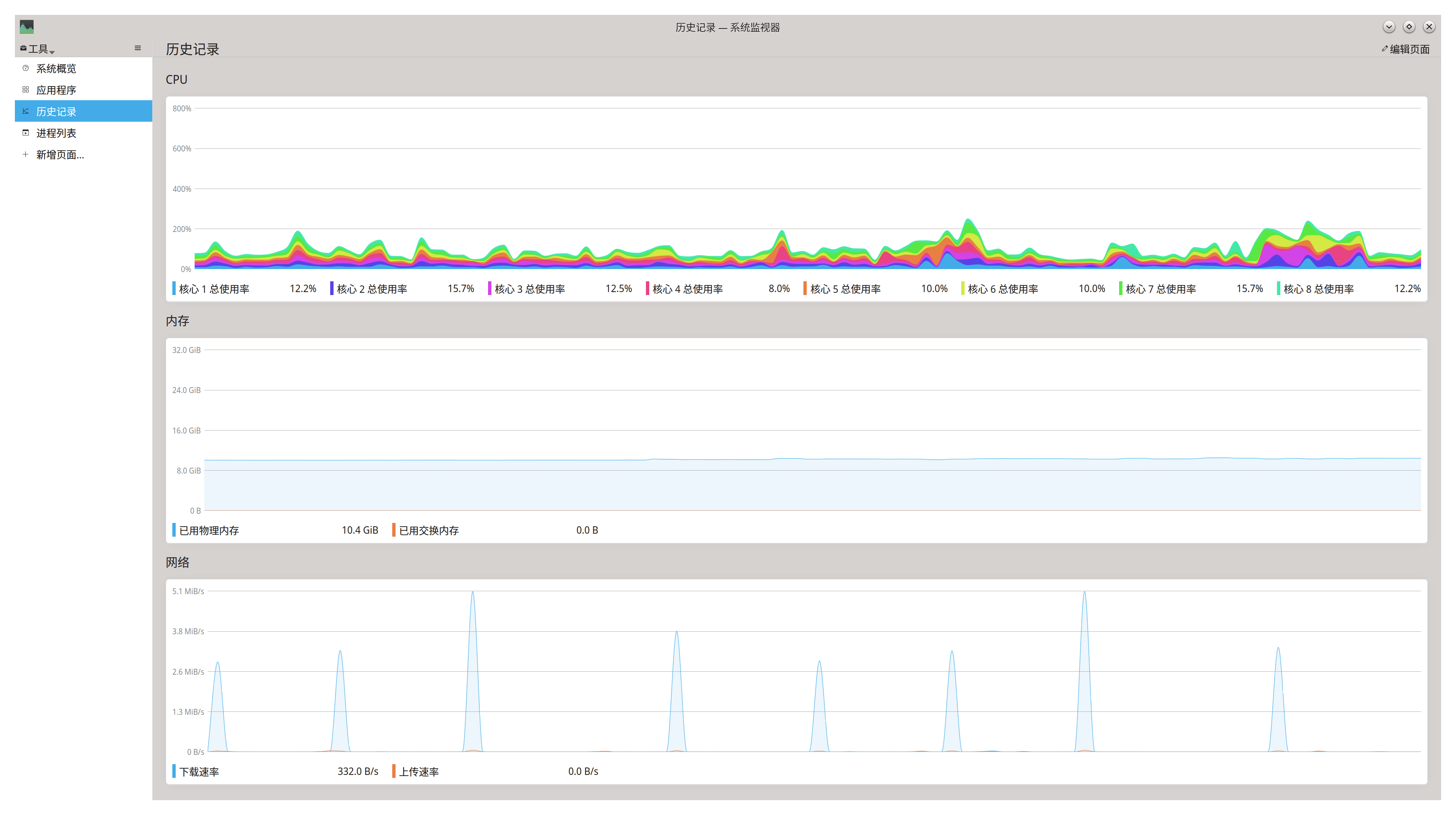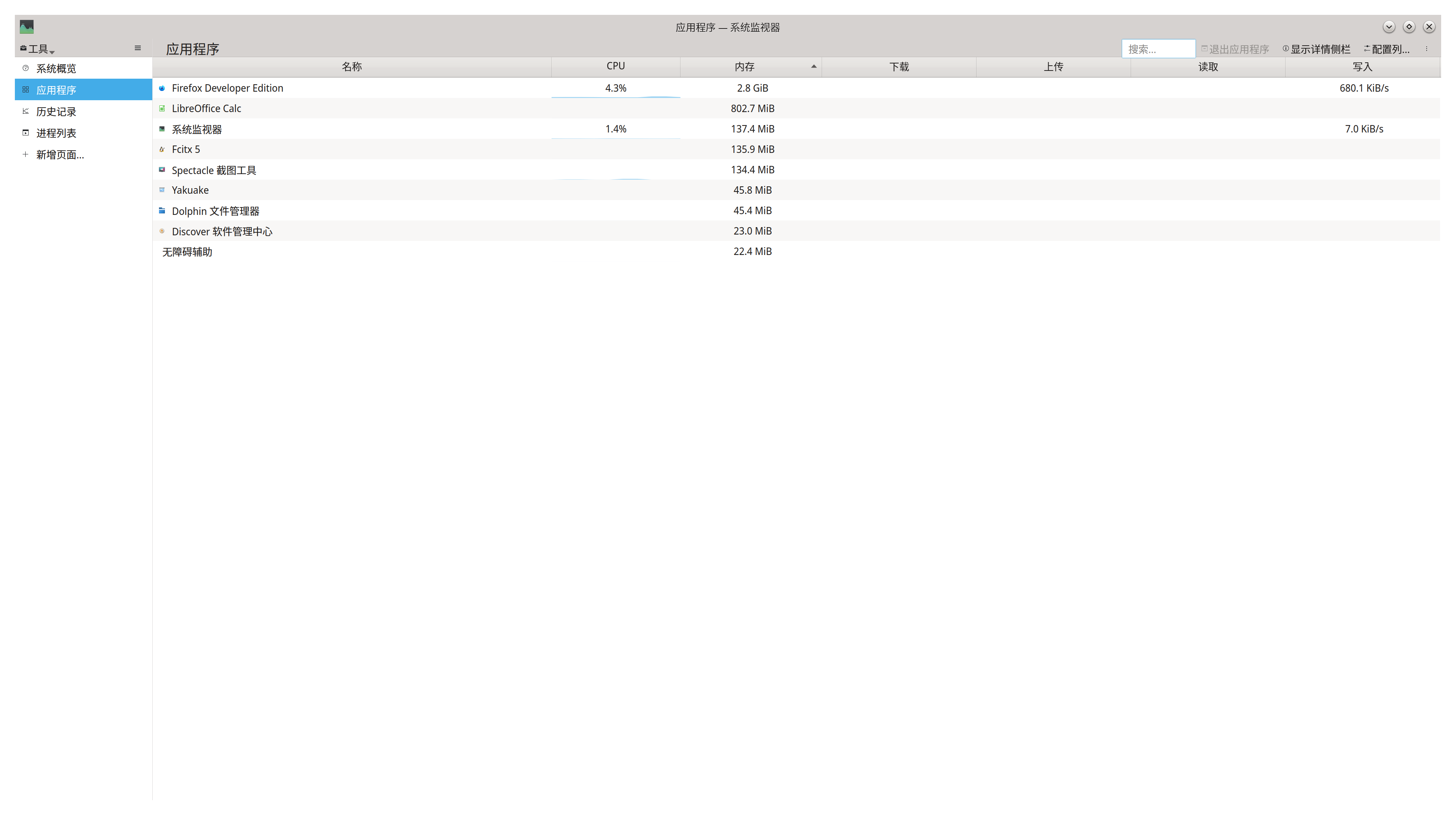使用KDE附带的GUI工具「系统监视器」是最方便的。这个工具与Windows下的任务管理器功能很相似,而且带有界面自定义功能,能够查看的信息非常的多。