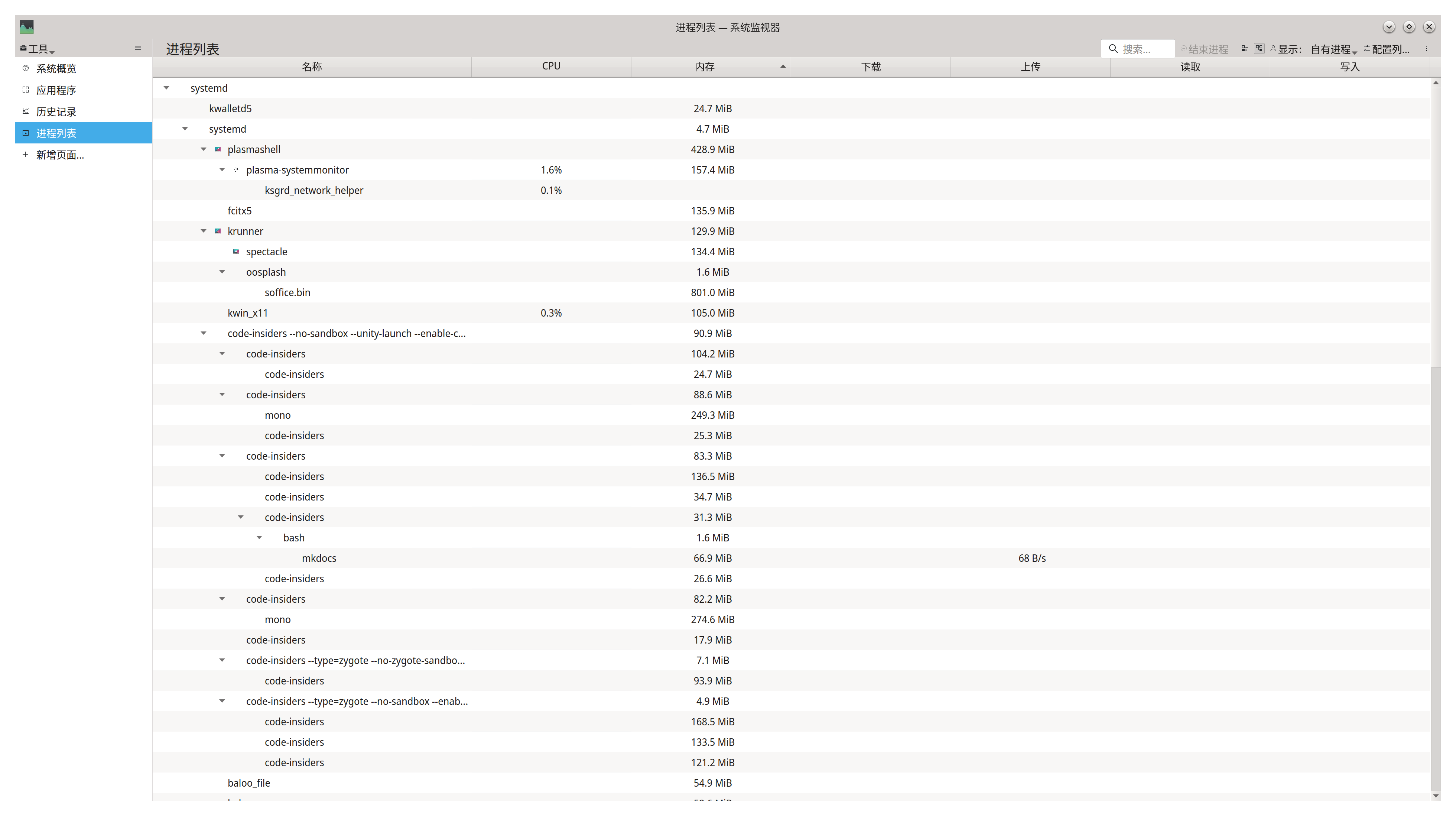可以看到我安装的VS Code(Code - Insiders)、fcitx5、KDE桌面环境等都名列其中。