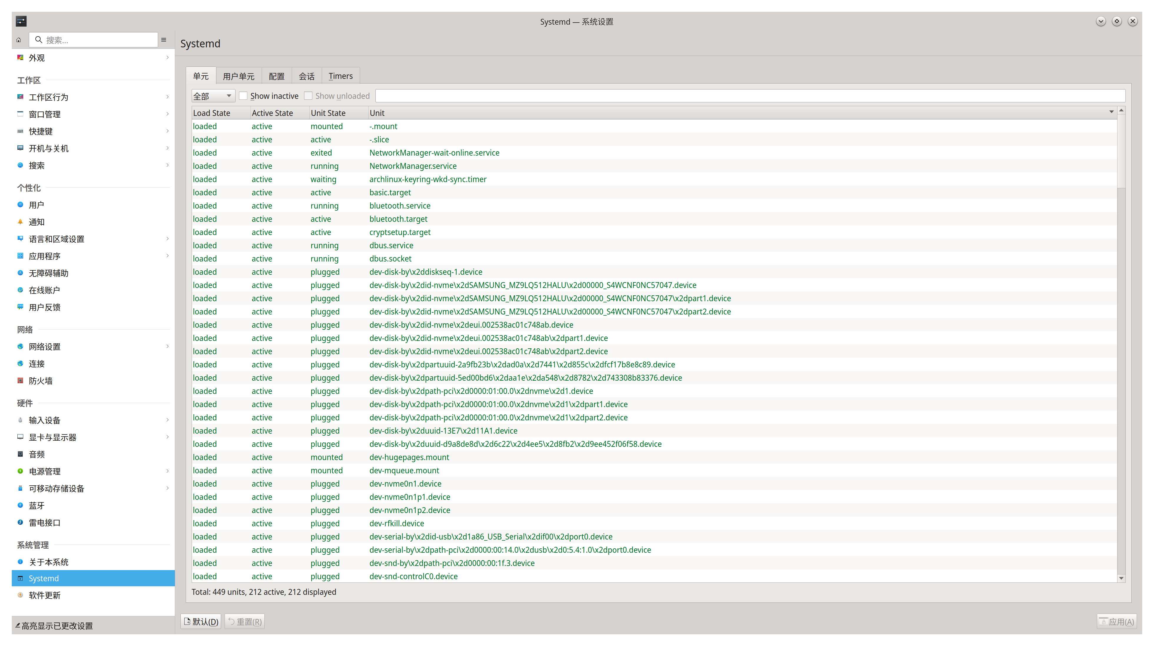 安装KDE的GUI工具systemd-kcm之后,可以在图形界面中方便的查看服务的状态,可以筛选,也可以对服务进行各种操作。