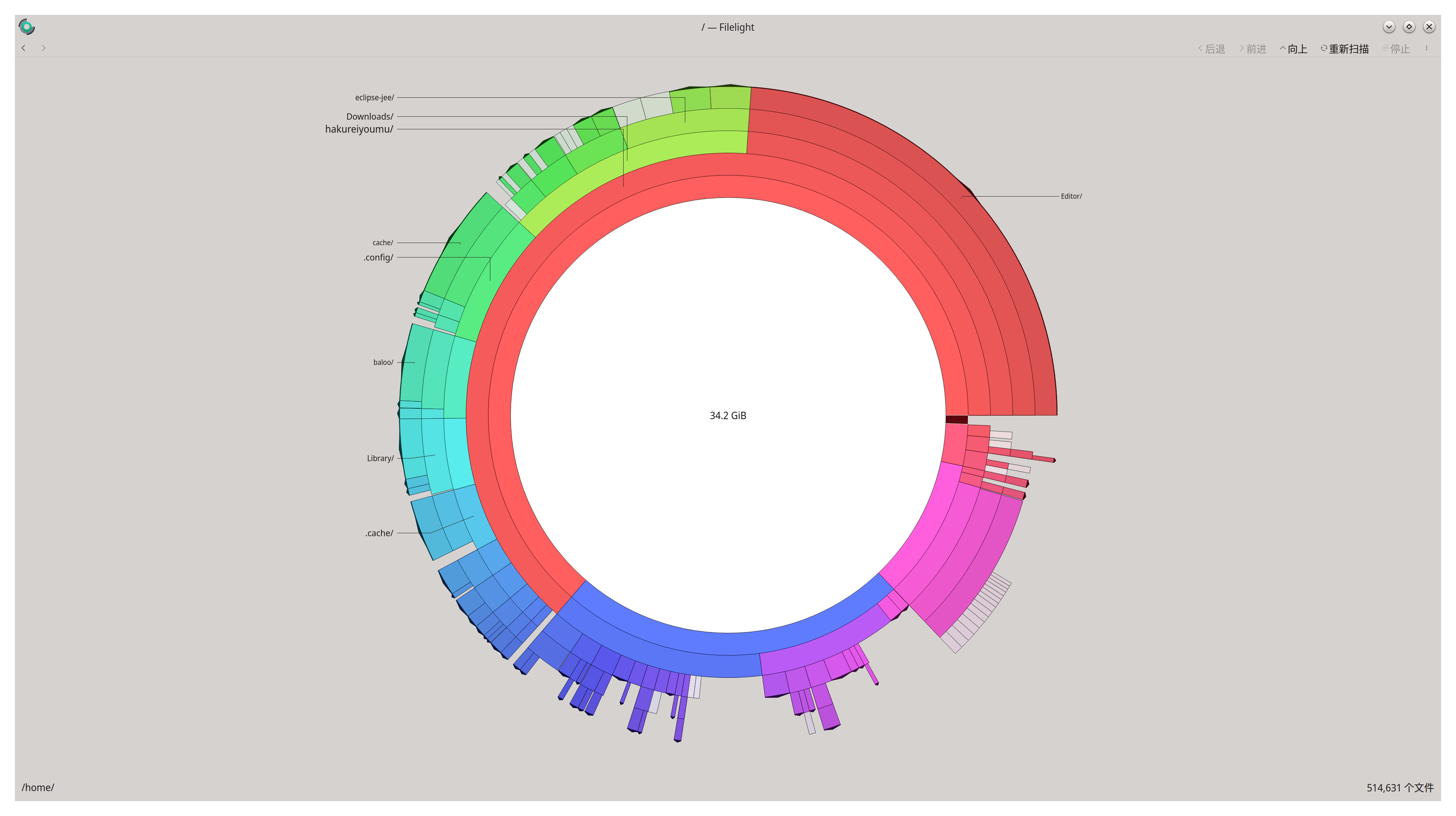 安装filelight这个包就可以使用了,它可以轻易的分析出各个文件夹的磁盘占用情况。