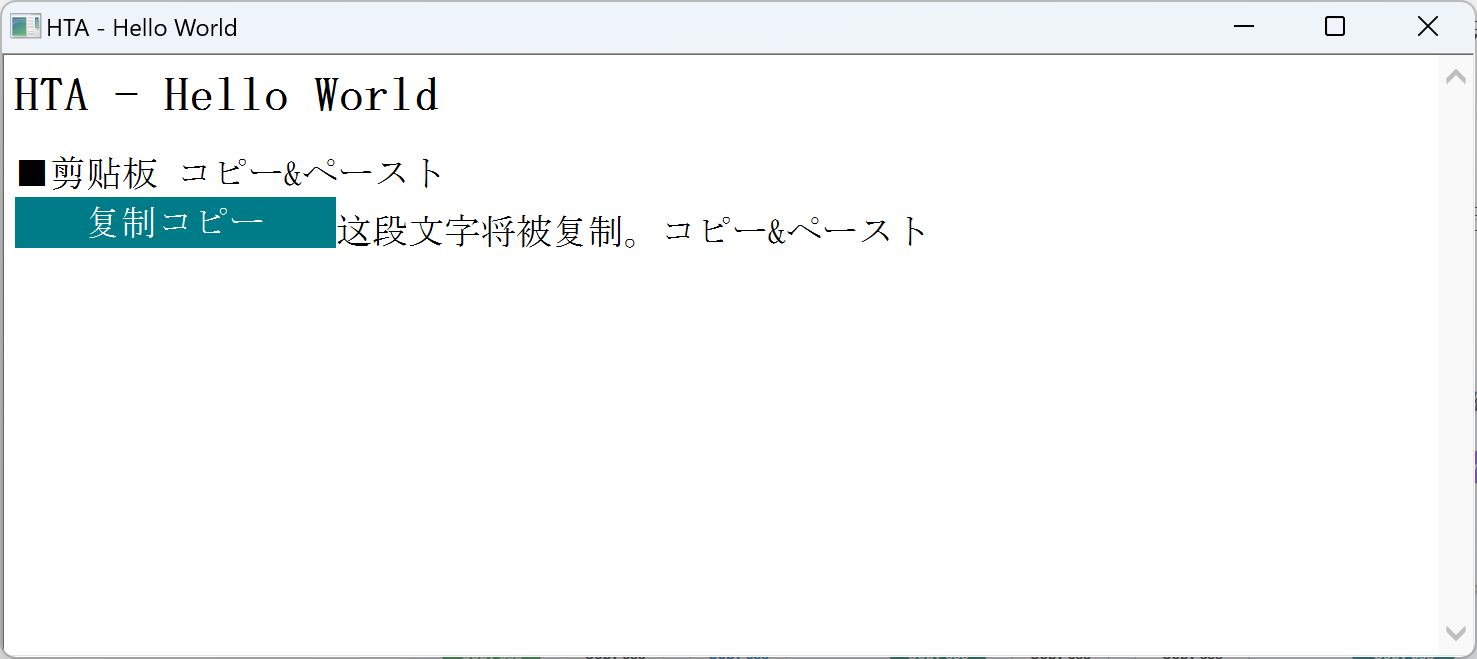 <input class="btn" type="button" value="复制コピー" OnClick="Copy('这段文字将被复制。')" />这段文字将被复制。コピー&ペースト